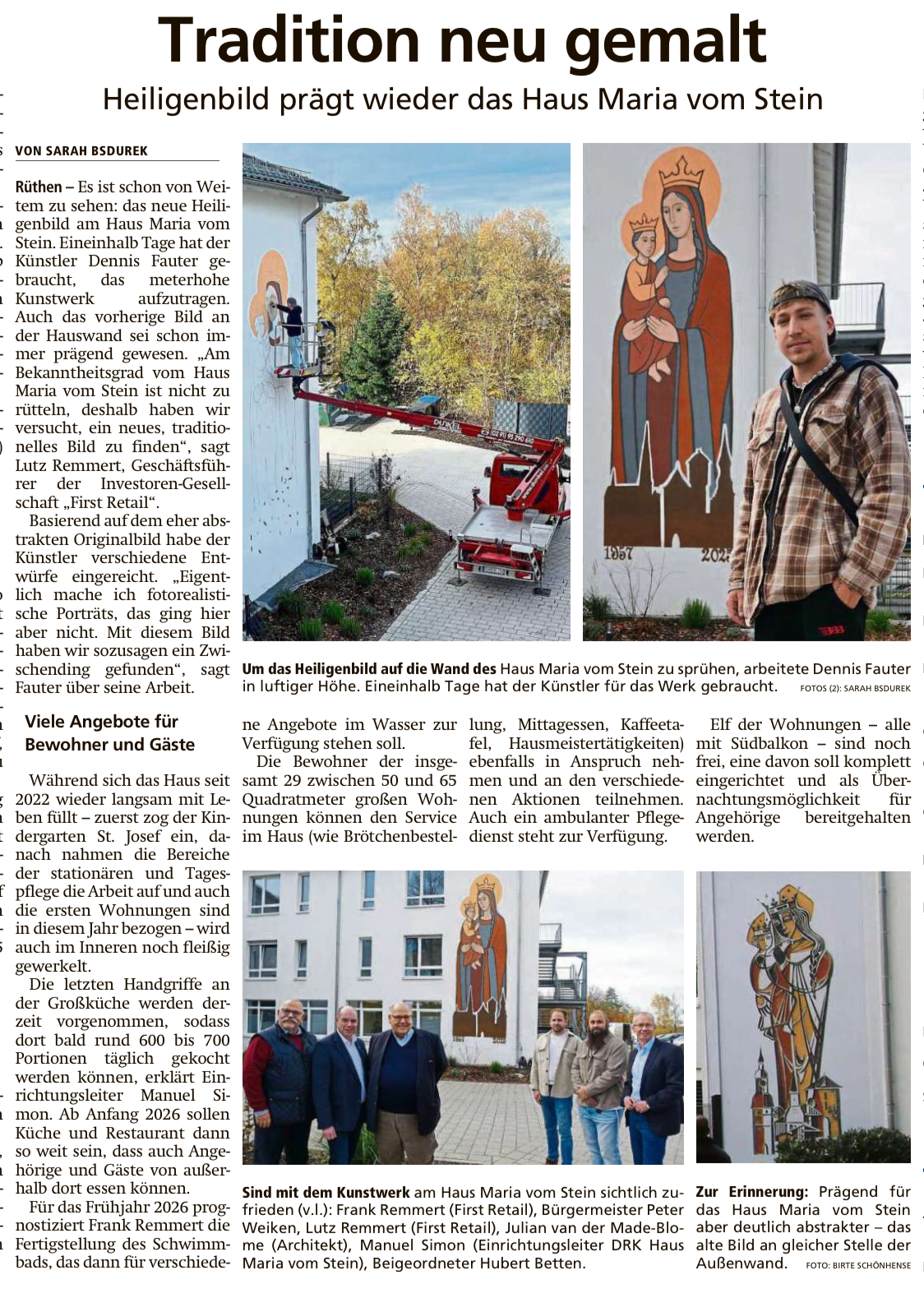 Die Fassade des „Haus Maria vom Stein“ in Rüthen hat einen neuen Blickfang erhalten. Eine eindrucksvolle, zeitgenössische Darstellung der Maria schmückt seit dieser Woche das Gebäude. Der Künstler Dennis Fauter gestaltete die Außenwand des ehemaligen Schwesternheims mit einer modernen Interpretation – inspiriert von der ursprünglichen Darstellung, die das Gebäude über Jahrzehnte prägte.